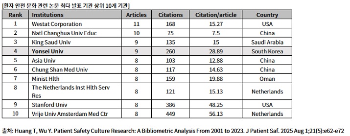 2025³â ±¹Á¦ ÇмúÁö <Journal of Patient Safety>¿¡ ¹ßÇ¥µÈ ¼ÁöºÐ¼® ³í¹®(Patient Safety Culture Research: A Bibliometric Analysis From 2001 to 2023)¿¡ µû¸£¸é ¿¬¼¼´ë´Â 2001³âºÎÅÍ 2023³â±îÁö ¹ßÇ¥µÈ ȯÀÚ¾ÈÀü¹®È °ü·Ã ÃÑ 595ÆíÀÇ ³í¹® Áß 9ÆíÀ» ¹ßÇ¥ÇØ ³í¹® ¹ßÇ¥ °Ç¼ö ±âÁØ ¼¼°è 4À§¸¦ Â÷ÁöÇß´Ù. ³ª¾Æ°¡ ³í¹®´ç Æò±Õ ÀÎ¿ë ¼ö ±âÁØÀ¸·Î´Â ¼¼°è 3À§¿¡ ¿Ã¶ó ¿¬±¸ÀÇ ÁúÀû ¿µÇâ·Â ¶ÇÇÑ ±¹Á¦ÀûÀ¸·Î ÃÖ°í ¼öÁØÀÓÀ» ÀÔÁõÇß´Ù.