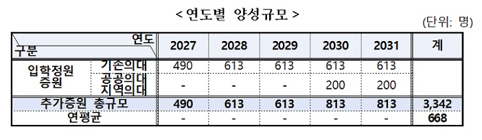 ¿À´Â 2027³âºÎÅÍ 5³â°£ ¼¿ïÀ» Á¦¿ÜÇÑ Àü±¹ Àǰú´ëÇÐ Á¤¿øÀÌ ¿¬Æò±Õ 668¸í¾¿ ´Ã¾î³´Ù.